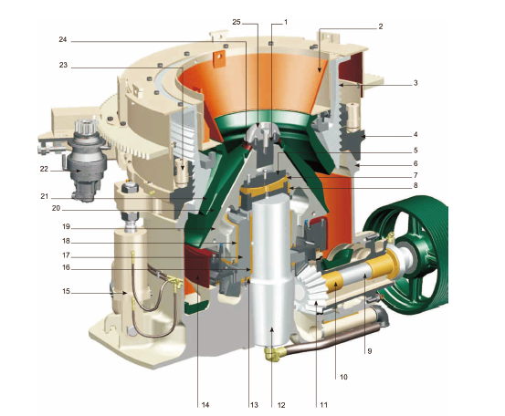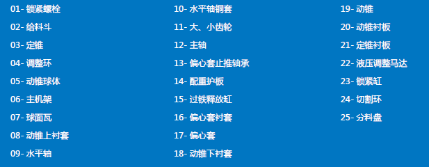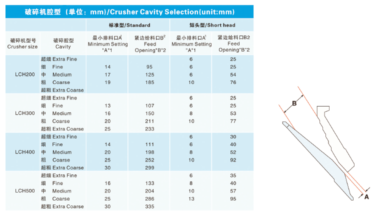 LCH 系列圓錐破碎機只需更換定錐襯板、動錐襯板、適配環(huán)和楔塊螺栓,即可將破碎腔型在短頭超細到標準超粗之間任意轉換。