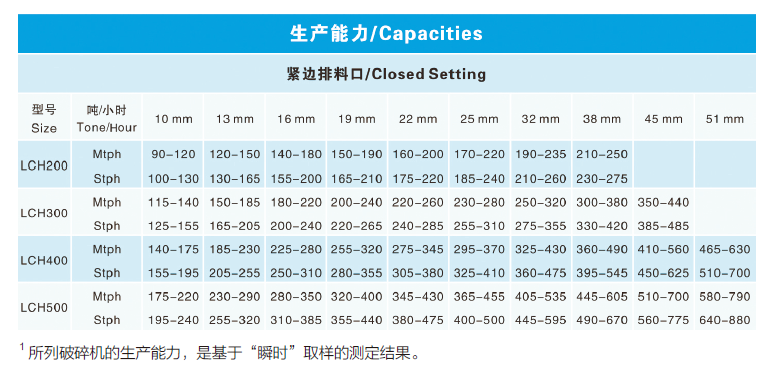 生產能力表可作為LCH 圓錐破碎機初步選型的工具,表中數據適用于松散密度1.6t/m3 的給料、給料中篩出小于排礦口粒級、開路作業(yè)條件下的生產能力。在給料中細粒級含量較高、閉路作業(yè)條件下,設備能力比開路作業(yè)高15%- 30%。破碎機作為生產回路中的一個重要組成部分,其性能的發(fā)揮部分取決于給料機、皮帶機、振動篩、支撐結構、電動機、傳動裝置及料倉等輔件的正確選擇和操作。
